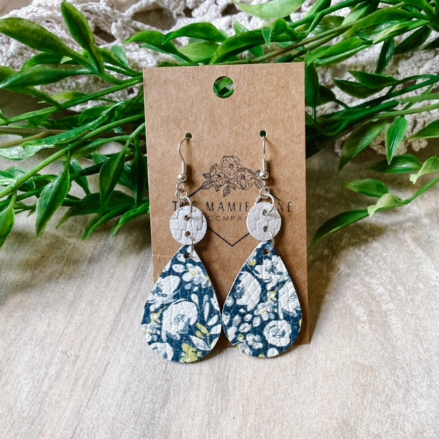 - Blue Floral Genuine Leather Teardrop w/ White Textured Leather Circle Connector
